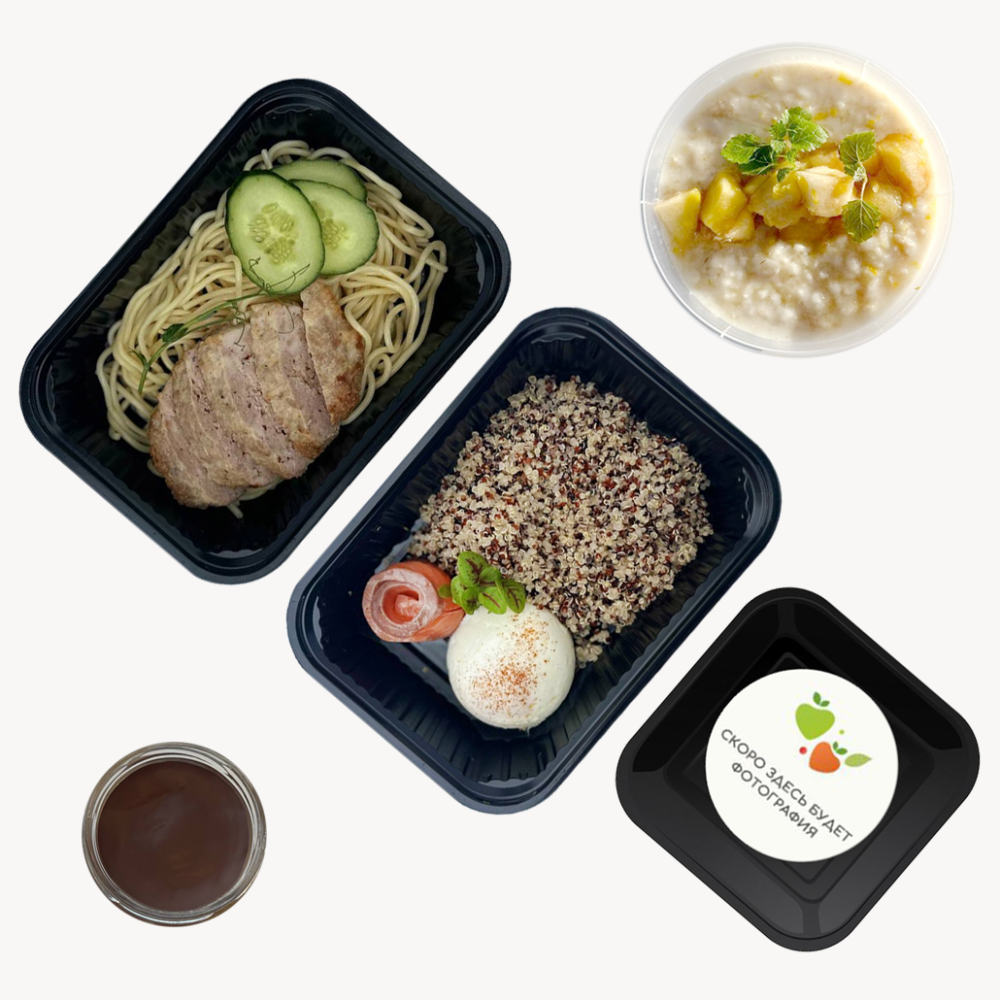 Завтрак: Каша овсяная КБЖУ: 1655525 Слайсы курицы КБЖУ: 139162 Обед: Спагетти с котлетой из птицы КБЖУ: 27222240 Чизкейк нутелла КБЖУ: 515143828 Ужин: Киноа с яйцом и рыбой КБЖУ: 26618926