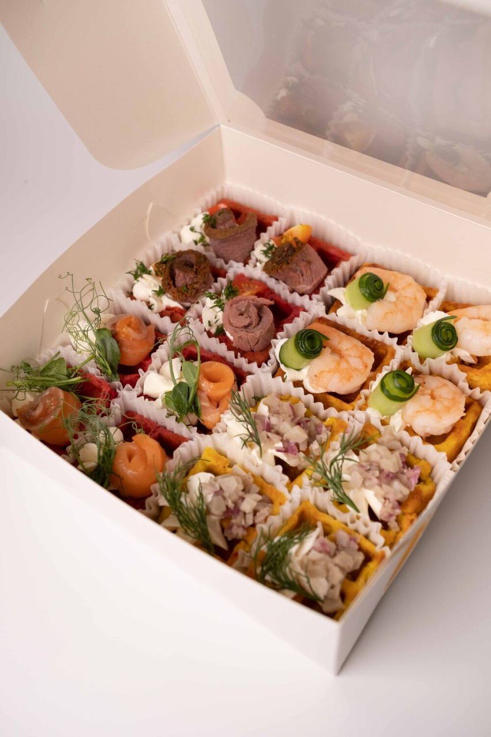 Свекольная вафля с ростбифом 4 шт по 45 гр. Свекольная вафля рыбой собственного посола с 4 шт по 45 гр. Картофельная вафля с груздями 4 шт по 45 гр. Тыквенная вафля с королевской креветкой 4 шт по 45 гр.