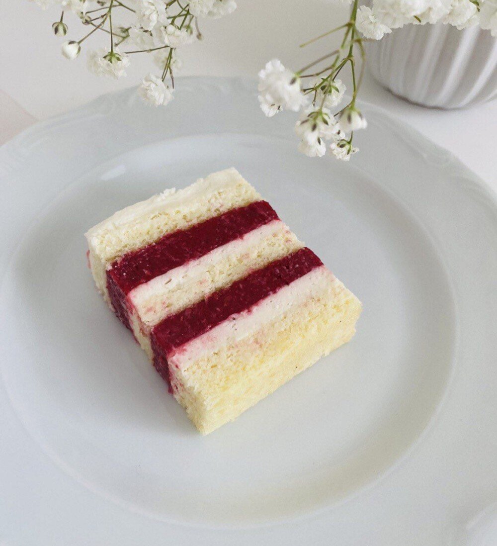 Яйцо куриное, творожный сыр, клубника, кокосовые сливки, молоко коровье 2,5%, кокосовое масло, мука гарнец универсальная (без глютена), инулин, сухое молоко 1,5%, эритрит, разрыхлитель, сок лимона, кукурузный крахмал, ванильная паста, желатин, вода, подсластитель Prebiosweet Fitness, натуральный краситель кармин, сублимированная малина.