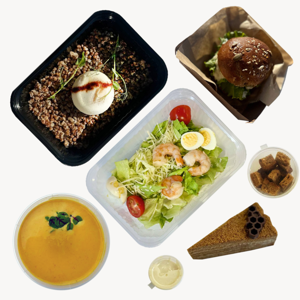 Завтрак: Гречневая каша с маслом гхи и яйцом КБЖУ: 268121430 Медовик КБЖУ: 22171027 Обед: Суп пюре тыквенный КБЖУ: 72639 Цезарь с креветками КБЖУ: 352182414 Ужин: Бургер фирменный КБЖУ: 427172436