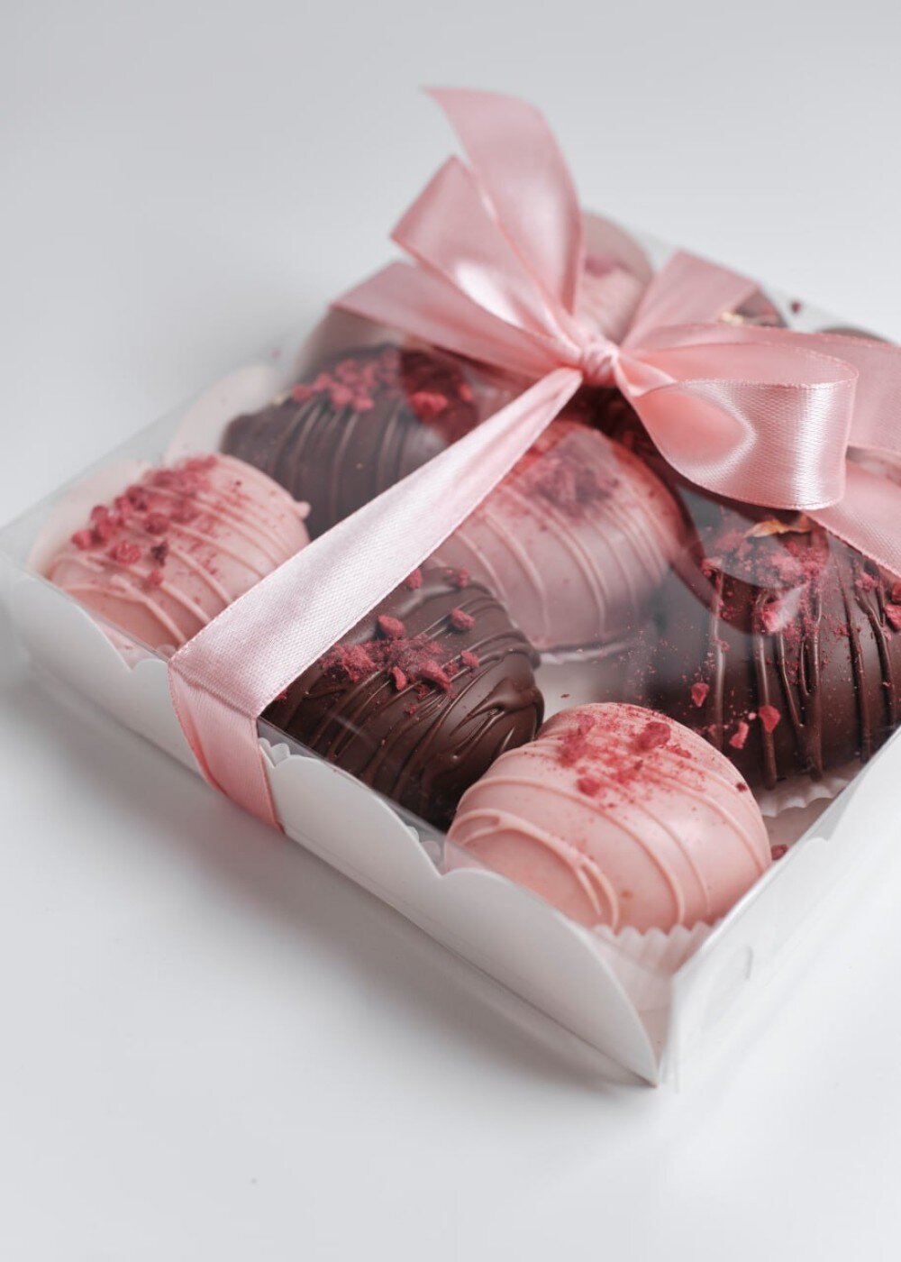 Насыщенный вкус шоколада пирожного «картошка» обёрнутый в нежнейший белый и молочный шоколад с сублимированной малиной, в виде сердец создаст незабываемые моменты счастья.