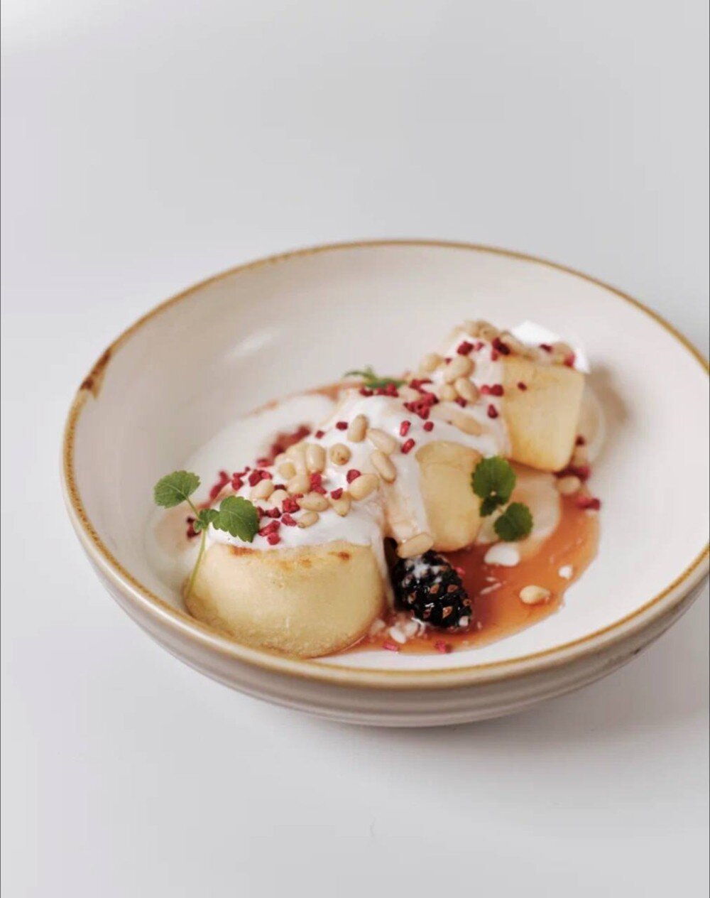 С вареньем из шишек, сметаной, кедровыми орехами и ягодной пудрой