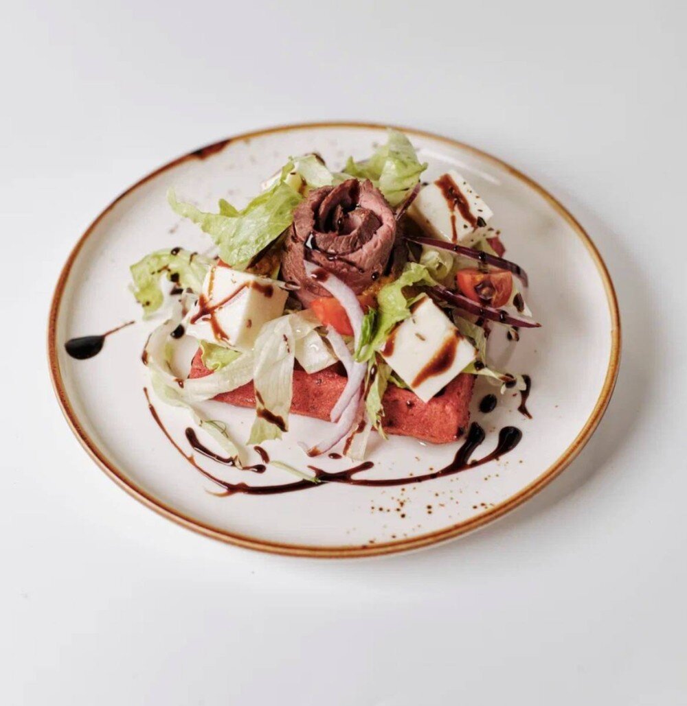Без глютена. Ростбиф, томаты, маринованная брынза под бальзамическим соусом.