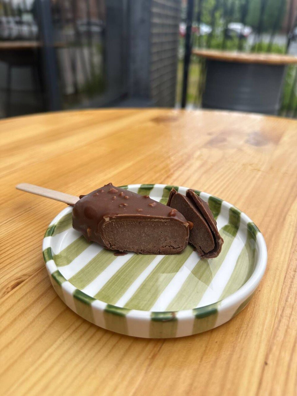 Без глютена, без сахара. Фундучная паста, банан, растительное молоко, какао, шоколад темный и кокосовое масло.