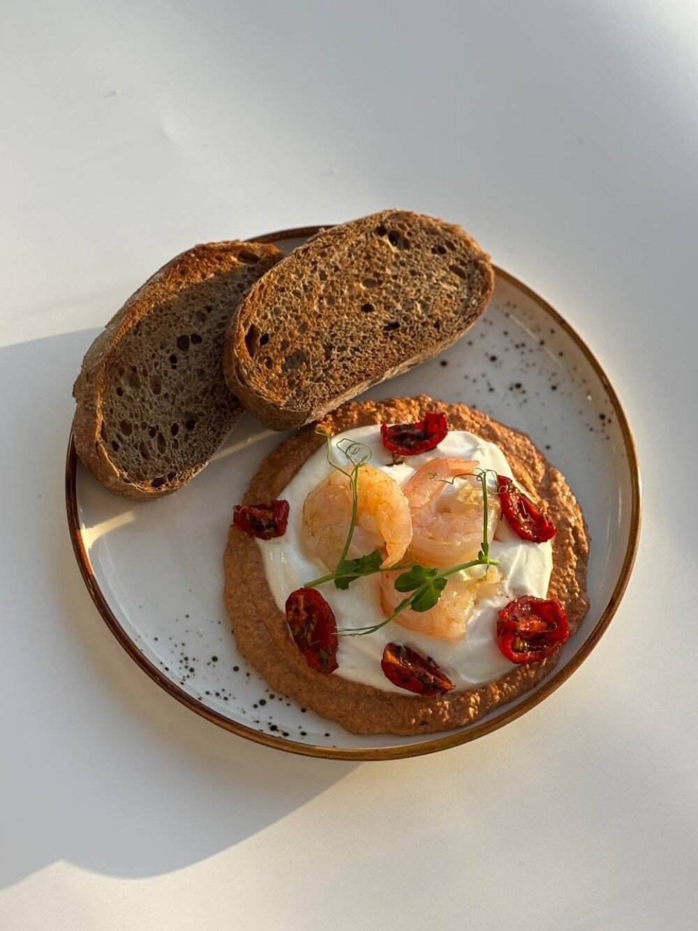 Соус из запеченных красных перцев с греческим йогуртом, креветками и вялеными томатами. Подается с хрустящим тартином.