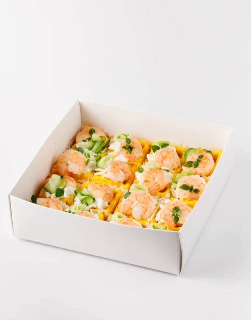 Сет тыквенных вафель с королевской креветкой и взбитым творожным сыром