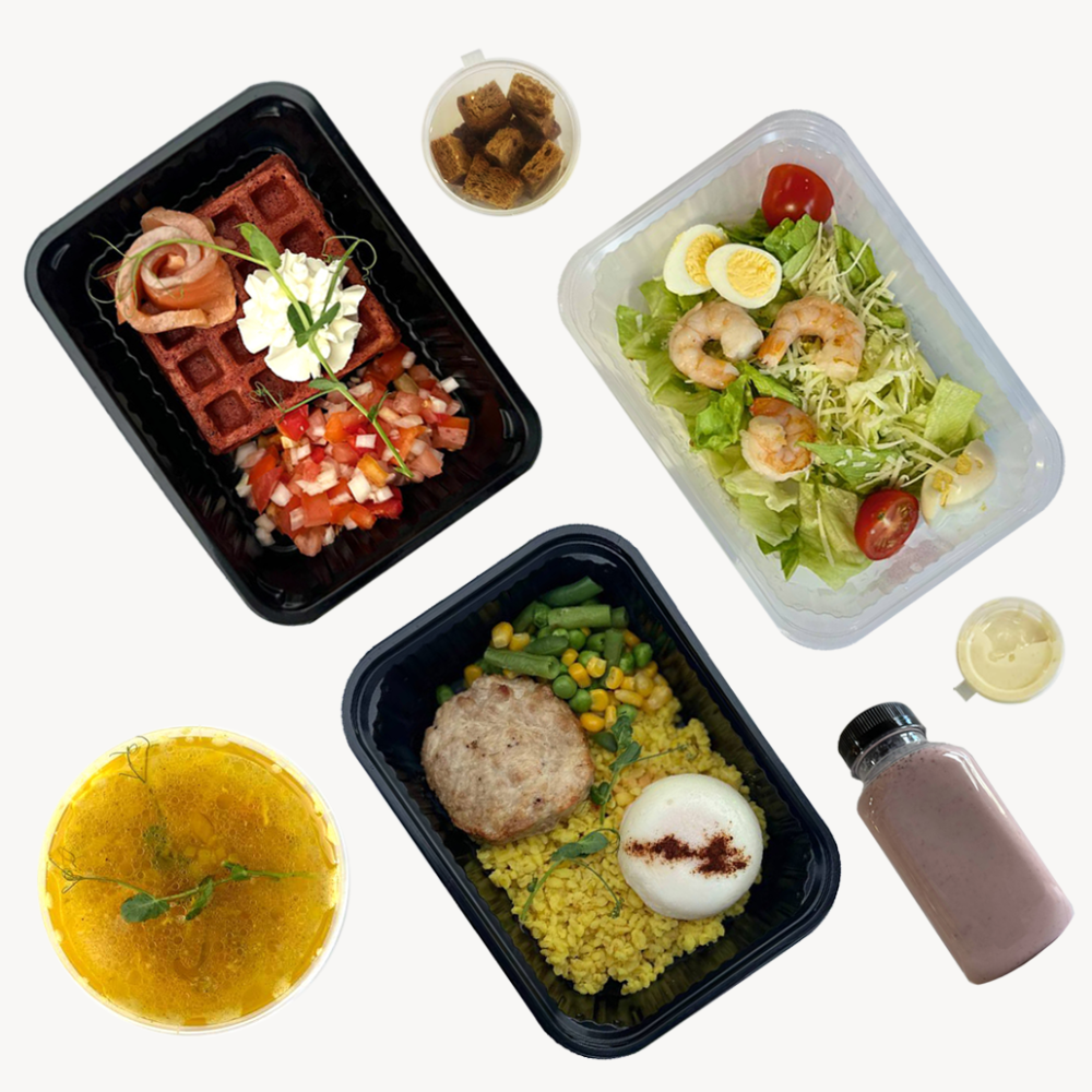 Завтрак: Свекольная вафля с рыбой КБЖУ: 348141932 Протеиновый коктейль КБЖУ: 17712915 Обед: Булгур с котлетой из курицы КБЖУ: 27324822 Ужин: Суп куриный КБЖУ: 2286372 Цезарь с креветками КБЖУ: 352182414